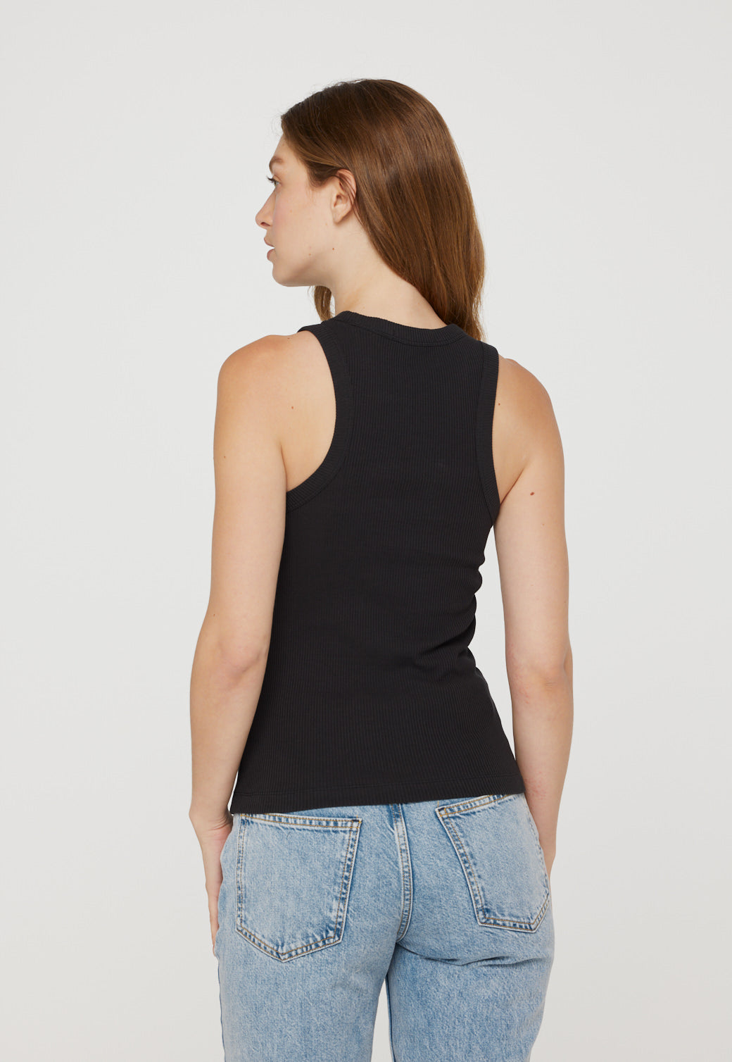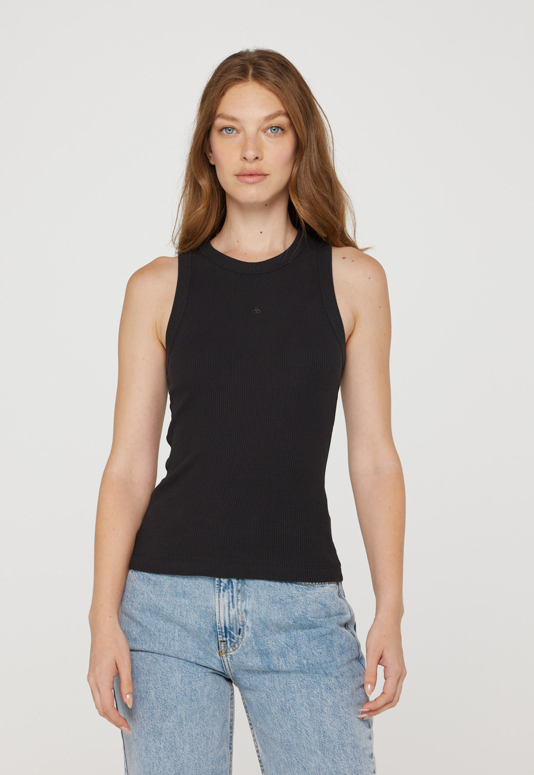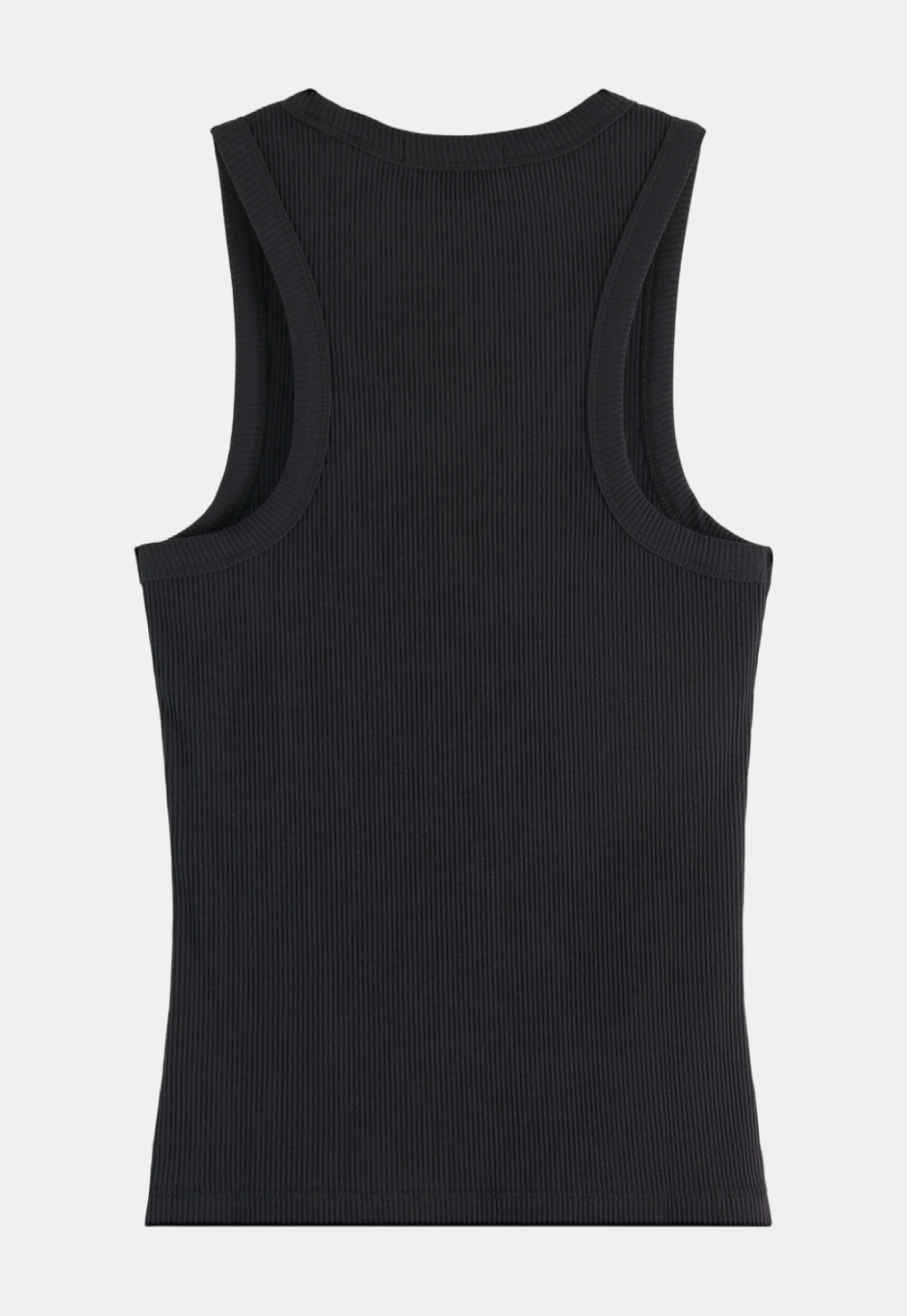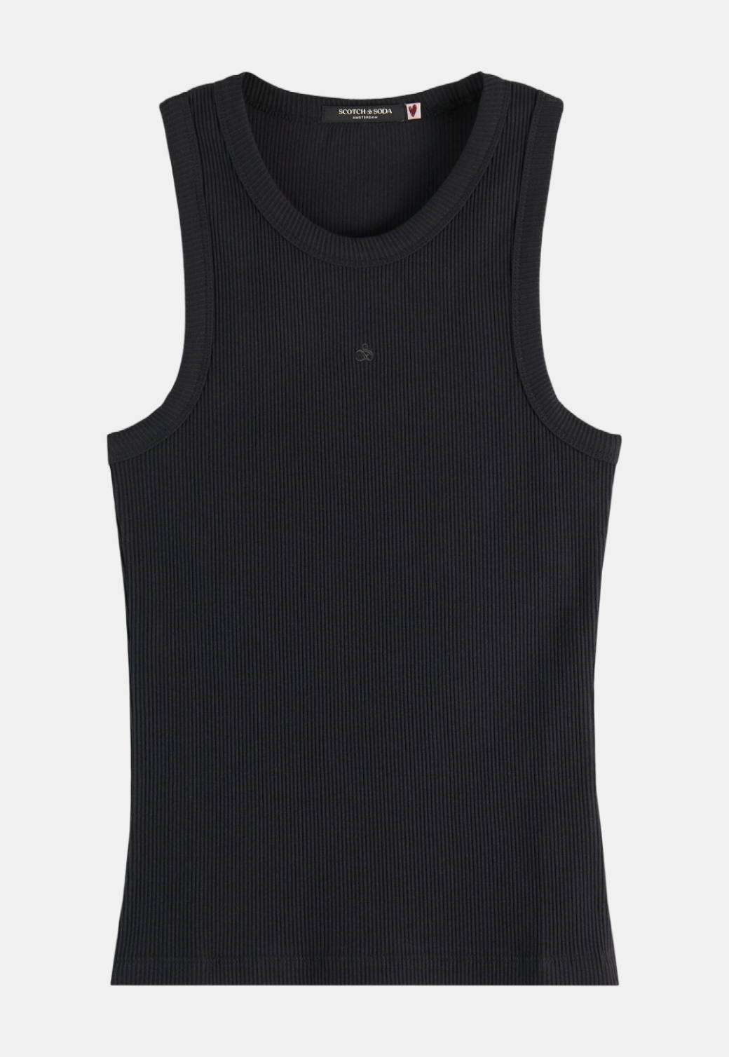גופיית ריב לנשים מבית המותג סקוצ אנד סודה. בגזרת רייסר צמודה עם מפתח עגול גבוה, עשויה בד ריב בשילוב לוגו של המותג רקום בפרונט.