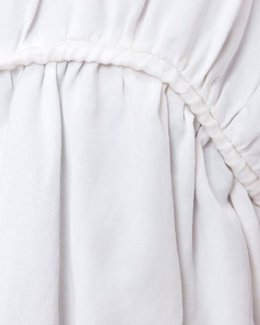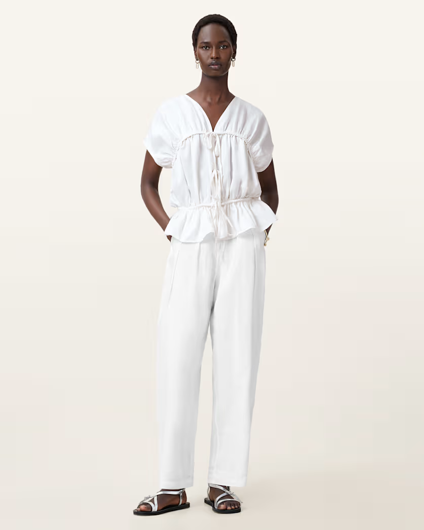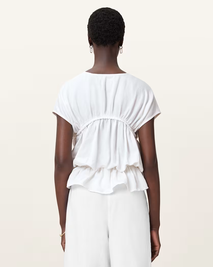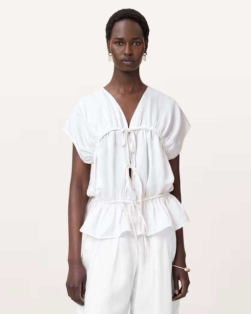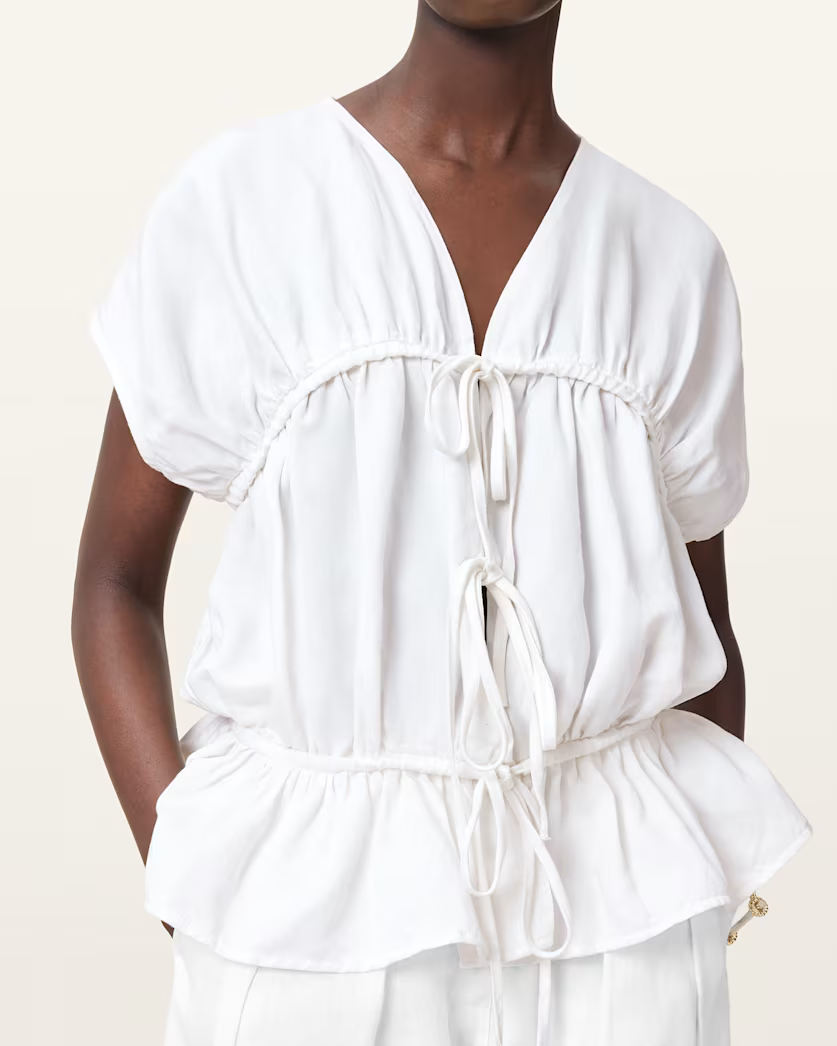 חולצה קצרה לנשים מבית המותג אולסיינטס. בגזרה משוחררת, עם כיווצים וקשירה בחזית, עם מפתח וי ושרוולים קצרים.