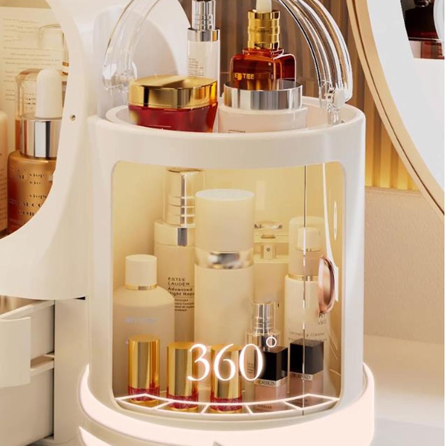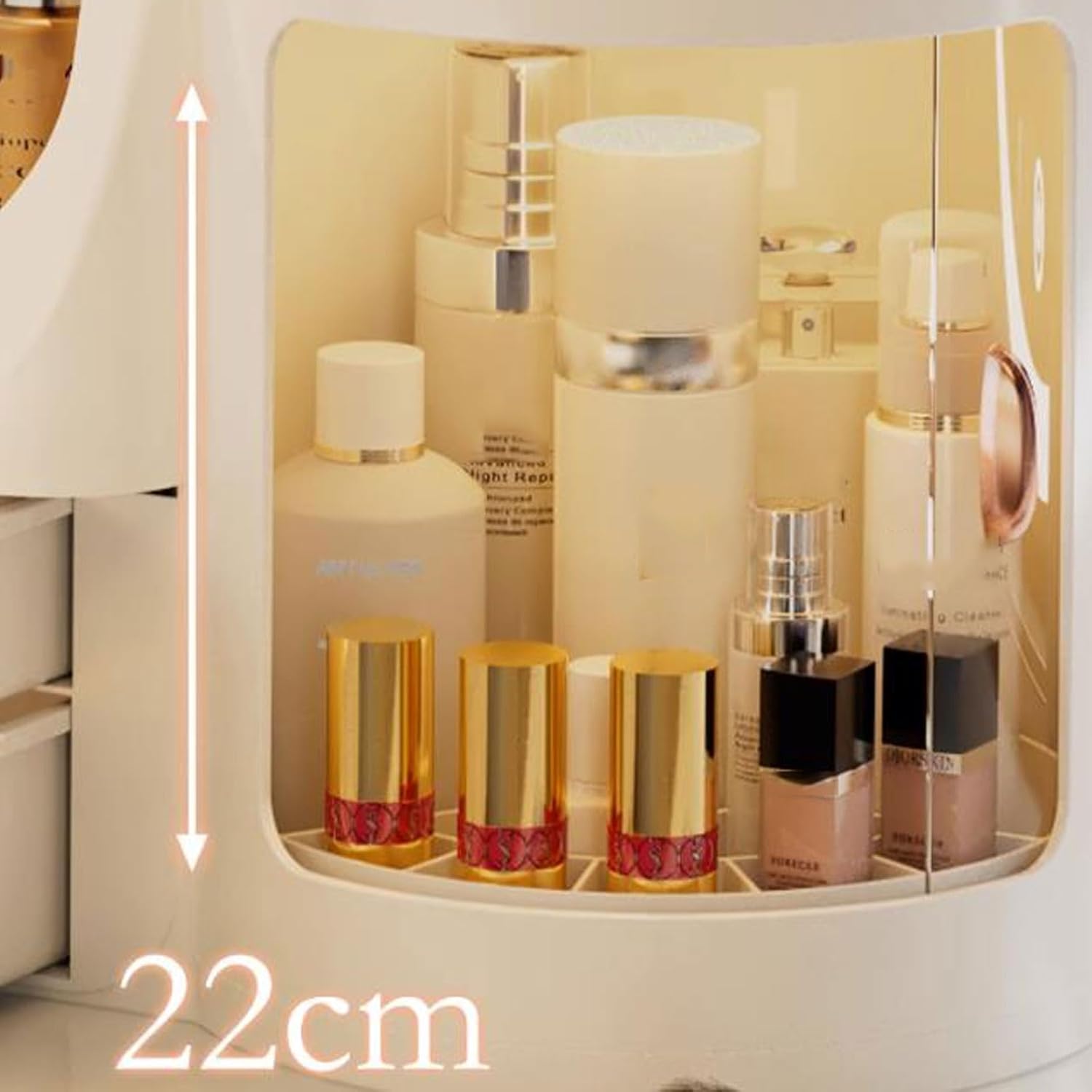 ™Glamora הוא ארגונית קוסמטית מסתובבת ב-360° עם מראה ושתי מגירות, המיועדת לאחסן מוצרי איפור וטיפוח העור בצורה מסודרת תוך שיפור שגרת היומיום שלך