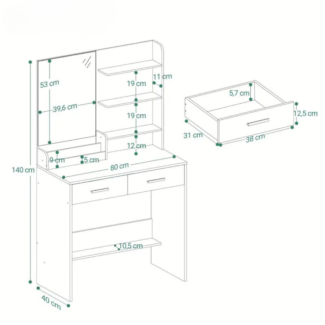 ה ™Serenya שידת איפור כוללת גימור לבן אלגנטי, מראה מובנית ותאי אחסון נרחבים לכל הצרכים שלך. בעיצוב פונקציונלי אך יוקרתי, מהווה תוספת מושלמת לחדרי שינה או אזורי התארגנות. עמידה ומעוצבת, מספקת שילוב של פרקטיות ונגיעה מודרנית לבית.